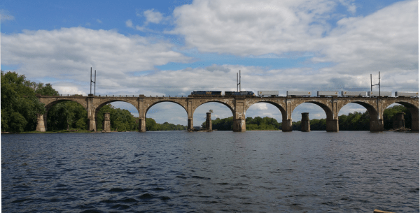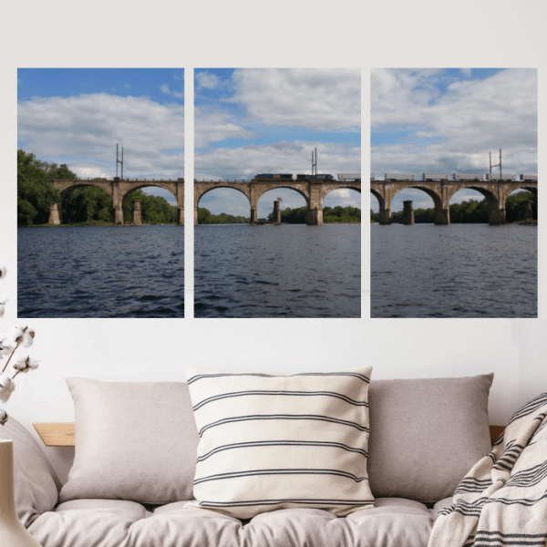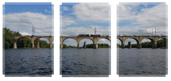 Let’s say that you want to take a wide photo and divide it into three standard-sized 24″ x 36″ inch panels to create something like this train bridge over a river for your wall.